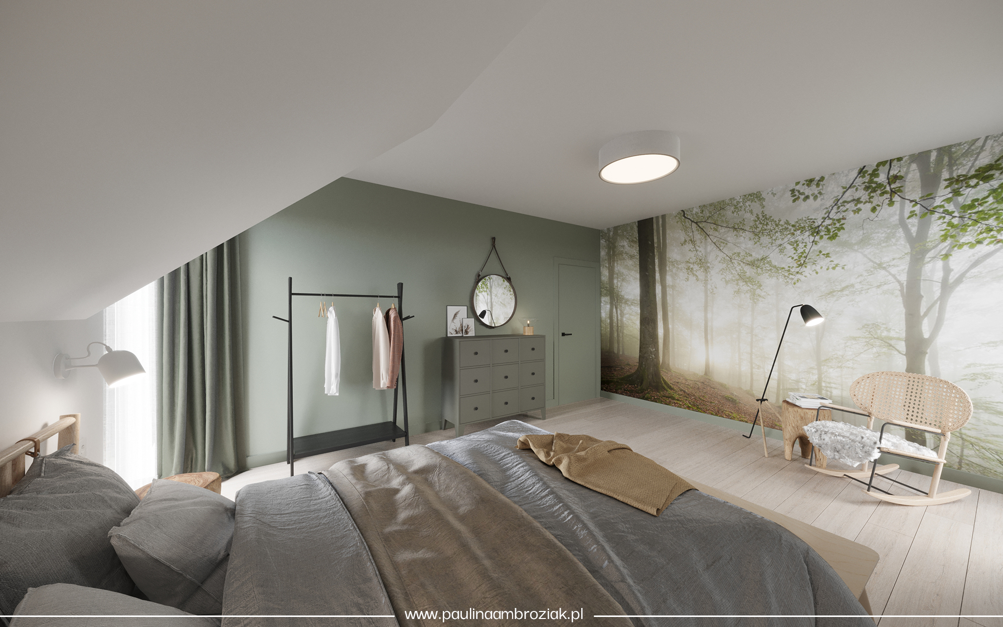 Dom znajduje się w czarującym leśnym otoczeniu, dlatego na parterze kolorem przewodnim była zieleń, która przenika się z zielenią, która jest za oknem. Założeniem było aby wnętrze stanowiło przytulną, ale jednak uporządkowaną i przez to linearną przestrzeń, która stanowi komfortowe tło do tego by móc spędzać miło czas w gronie rodziny przy wielkim stole jadalnianym, czy siedząc na wygodnej sofie przed kominkiem. Na piętrze każdy z pokoi jest inny, a przez to dopasowany do charakteru jego użytkownika.